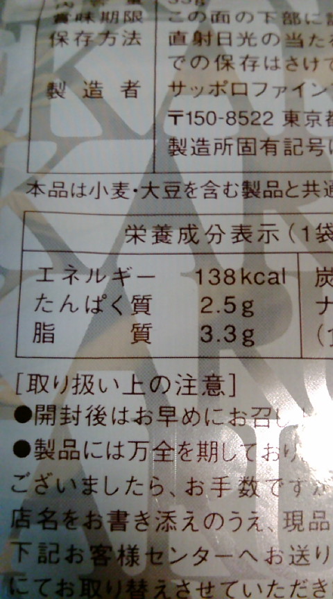 先生曰く「ちょっとだけど赤みがひいてきたね」と。 自覚症状は相変わらず変わってないんですけどね^^; んで、どうやら5月から今診てもらっている先生が他の病院へ移られるとの事なので、来月診てもらった後は消化器内科の受診日の先生に変更してもらるみたい。 病院へ行くのが一度で済むのは便利便利。 早速今日あらびき黒胡椒味を買って来ました。 カルビーのポテチは90gで脂質は32g程。と計算したのでほぼあっていました。 ちなみに、コンビニではカルビーのポテチと同じ値段でした。脂質の減量分を差し引くと若干量が少ないかな?とは思いますが、袋を開けて中を見ても軽いだけで少ないって感じはしませんでした。 これなら今後も買って食べても良いなと思うので、首都圏での先行発売で終わっちゃわずに、新しい定番として長く売られると良いな。 サッポロ ポテかるっ あらびき黒胡椒味 33g サッポロ ポテかるっ うすしお味 33g